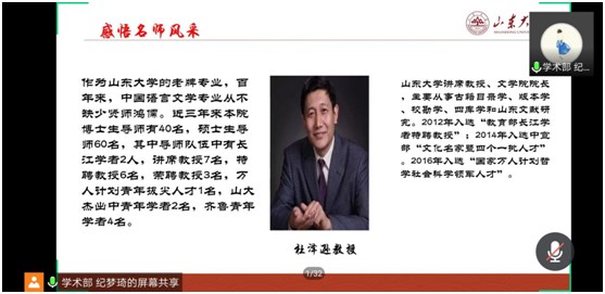 紧接着,纪梦琦向新生们介绍了248cc永利集团以院长杜泽逊为代表的共8位在职名师。“百年山大,文史见长”,汉语言文学专业作为百年山大的老牌专业,在发展过程中从未缺少贤师鸿儒,学科实力雄厚,为培养具有扎实学术能力的人才做出了重要贡献。