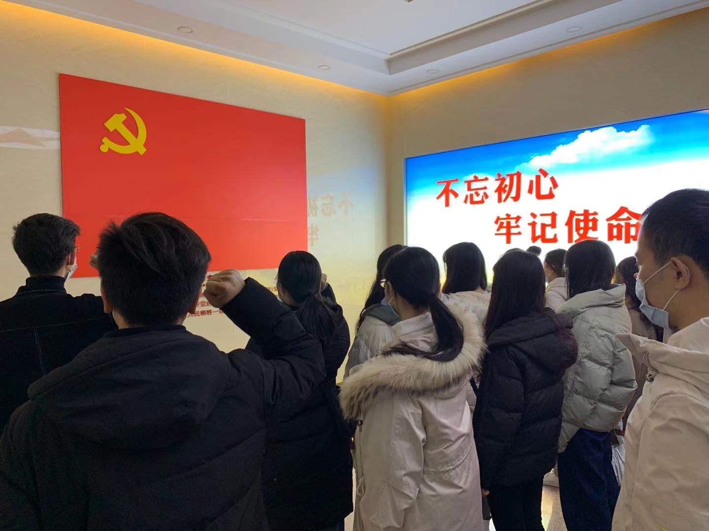 最后,此行全体党员来到陈列馆二层,面对悬挂的巨幅中国共产党党旗,一起重温入党誓词。大家高举右手,庄严宣誓,一字一句坚定有力地回响在整个大厅。入党誓词并不难记,难的是终身坚守。张博说,希望各位同志能够将入党誓词内化于心,外化于行,不忘共产党人的初心,思考自己作为新时代学生党员的历史使命,争做堪当民族复兴大任的时代新人。