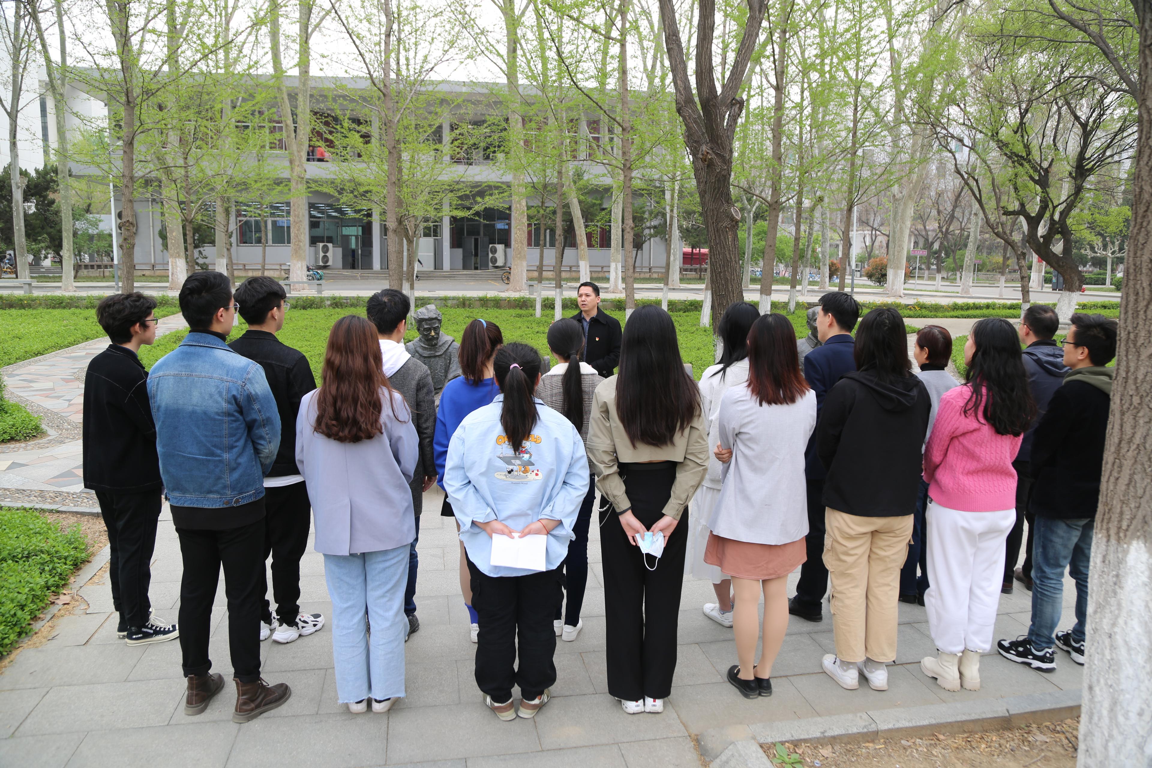 下午4时,党员们来到位于公教楼前的闻一多、臧克家雕像前。张洪刚为大家讲述了二位先生就职求学于山大时动人的师生情谊。闻一多破格录取臧克家的故事成就了山大校史上的一段佳话,二位先生的道德文章更为今天的山大学子树立了光辉的榜样。张帅指出,今年是中国共产党成立百年,也是山东大学建校百廿。在清明节即将到来之际,我们怀着无比崇敬的心情,深切缅怀在党史、校史和院史上做出过突出贡献的山大先辈,具有十分重要的意义。作为党员,我们要继承和发扬好先辈们身上的山大精神、文院精神,增强锐意进取、开拓创新的勇气和能力,以实际行动践行初心使命、告慰前辈先贤。