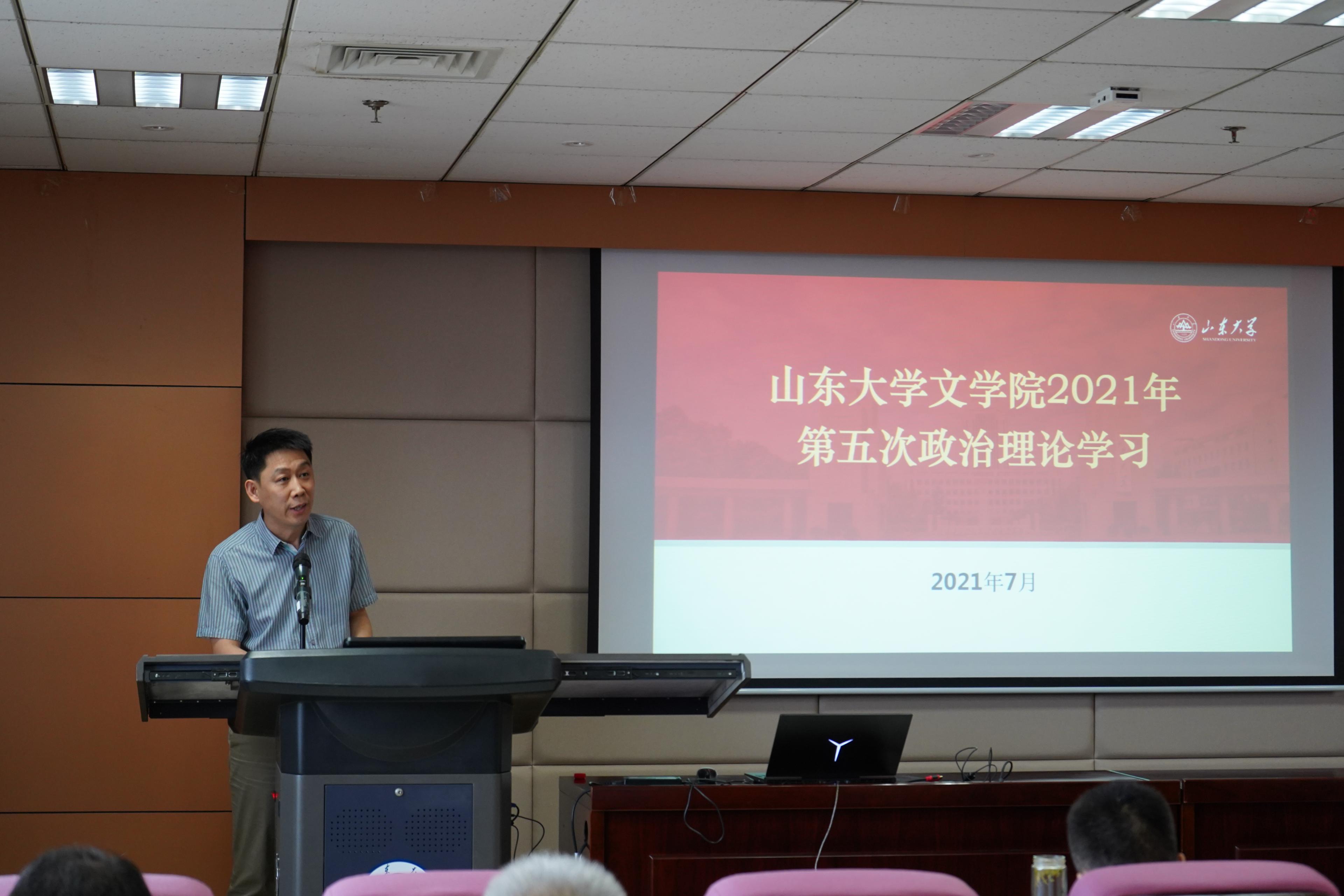 张帅首先带领与会人员学习了习近平总书记在庆祝中国共产党成立100周年大会上的重要讲话精神。他认为,“以史为鉴、开创未来”的思想方法和实践要求是我们学习此次“七一”讲话精神的重要抓手。回顾百年奋斗的光辉历程,中国共产党团结带领人民,不畏强敌、不惧风险、敢于斗争、勇于胜利,始终坚定理想信念,不忘初心使命。百年前的先驱们创建了中国共产党,“坚持真理、坚守理想,践行初心、担当使命,不怕牺牲、英勇斗争,对党忠诚、不负人民”的伟大建党精神就此形成。张帅强调,我们同样要将伟大建党精神作为涵养新时代山大精神和山大文化的精神之源,全体教职工应继承光荣传统,赓续红色血脉,秉承实事求是的优良传统和工作作风,为实现中文“A+”学科的目标而只争朝夕、艰苦奋斗。他勉励文学院全体教职工要积极主动把握习近平总书记“九个必须”的精髓要义,明确其实践要求;落实到思想和行动上,就是要以立德树人为根本,擦亮“教育报国”和“为国育贤”的办学初心,彰显“重情义、尚风骨、尊学术”的文院品格,为建设担当中华民族复兴大任的世界一流大学做出应有贡献。