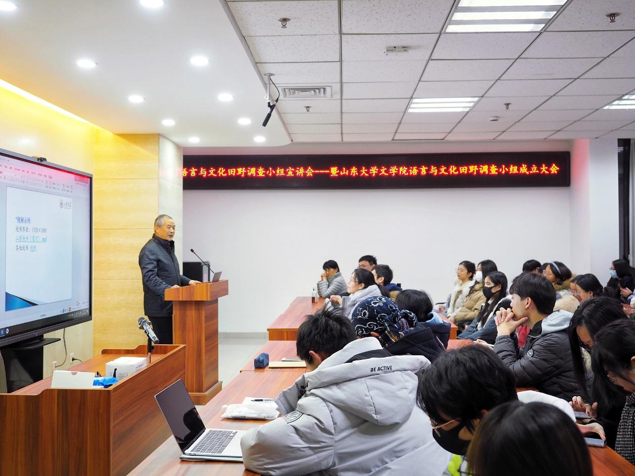 接下来,张燕芬副教授向同学们宣讲语言与文化田野调查小组章程及注意事项。该小组以山东大学方言研究中心和山东大学语言科学实验中心为依托,邀请张树铮、岳立静、刘娟、张燕芬等担任指导教师,旨在保护方言资源,传承中华优秀传统文化。小组的活动专业性与个性化相结合,分为集体田野调查和个人田野调查两部分,集体田野调查与教师的科研任务结合,于节假日不定期举行,每次调查活动人数筛选精控在15人以内;个人田野调查由学生于寒暑假回家时通过录音录像等方式自行开展,主要包括童谣、民歌、手工艺、农耕农具等主题。采录后的材料上交指导教师择优进行展示,有进一步研究价值的素材可以展开后续的调查和研究。