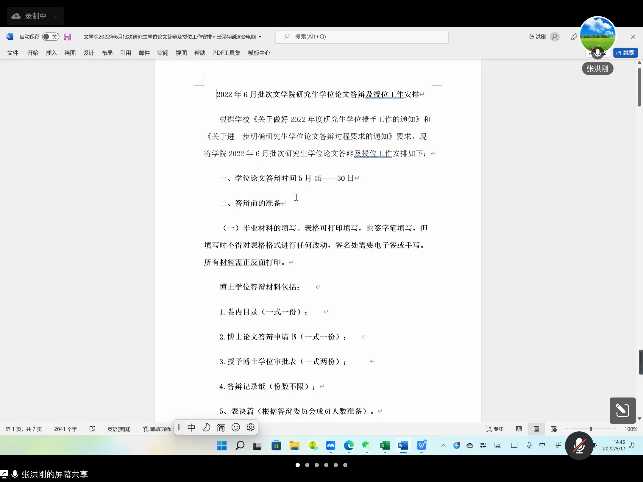 随后,张洪刚为同学们讲解了文学院2022年6月批次研究生学位论文答辩及授位工作安排,详细介绍了答辩时间、答辩前需准备的网络软件、答辩材料、答辩注意事项以及答辩后的相关补充工作、学位论文不端检测等事项,让同学们更为清晰地了解毕业答辩的流程,以便做好相关准备。最后,张洪刚就同学们针对自身情况提出疑惑进行了详细解答。