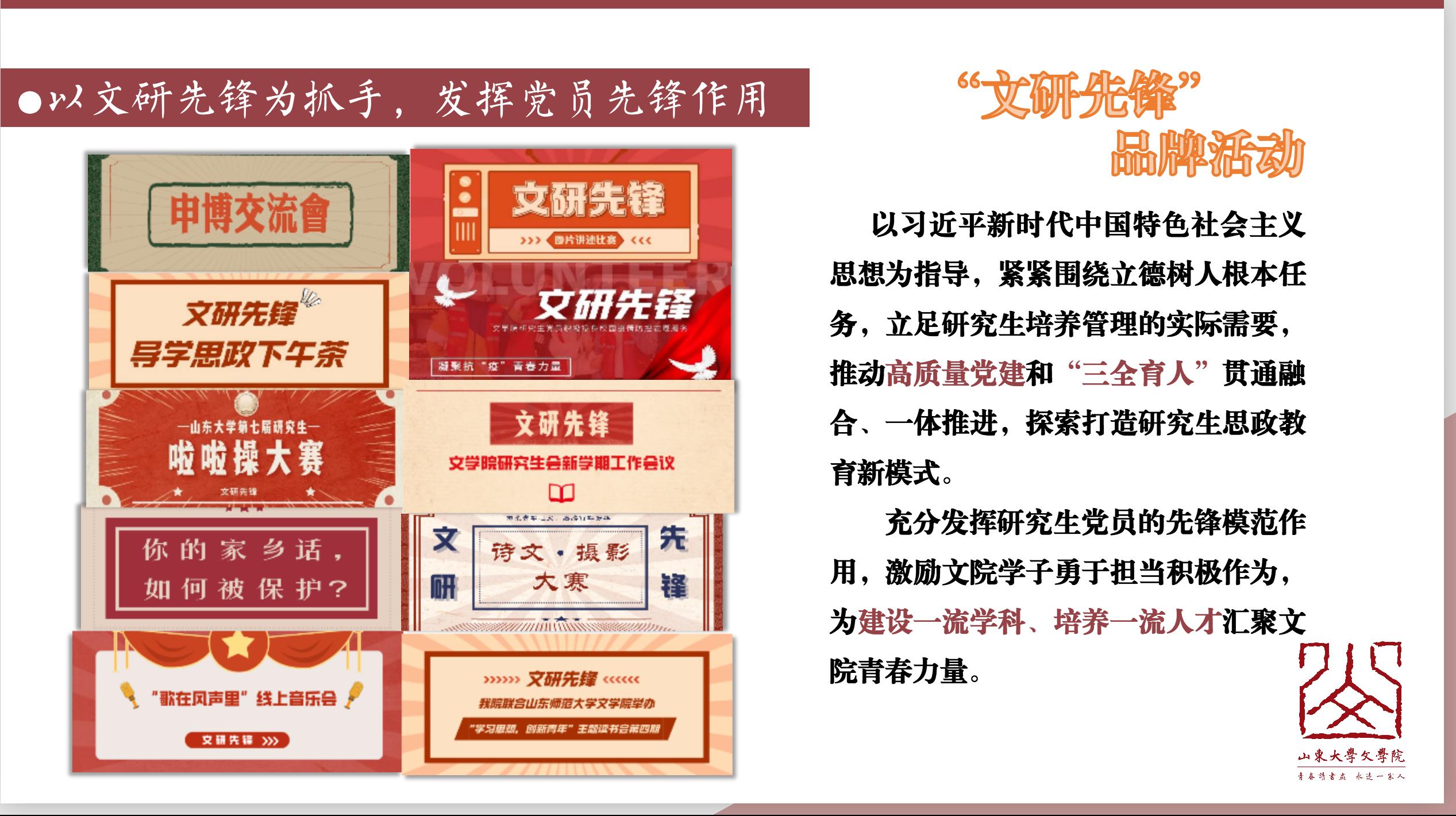 248cc永利集团研究生会高度重视思想建设,聚焦政治引领,定期组织专题学习活动,开展“文研先锋”品牌项目活动十余期,采用聚谈沙龙、专题讲座、沉浸式工作坊等多种形式,探索跨学科、多领域的生涯规划教育新模式,不断提升248cc永利集团研究生思想素养与生涯规划能力,助力研究生坚定理想信念,增强实干本领;依托“山大文研记”公众号,打造示范引领平台,专题报道校奖国奖获得者、优秀毕业生等先进个人事迹,深入挖掘榜样故事,树立身边典型,积极传递向上向善正能量。
