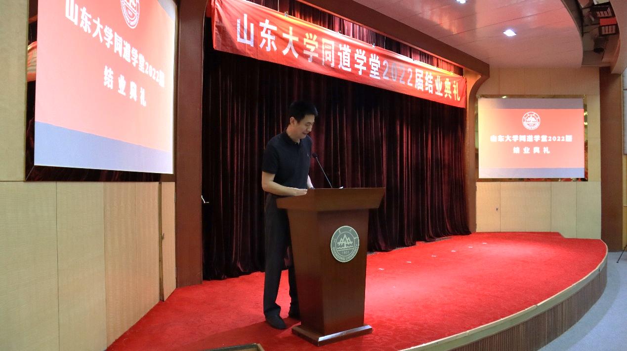 同心筑基重情义,道合圆梦尚风骨。近日,同道学堂2022届结业典礼在中心校区邵馆报告厅举行。校党委副书记王君松,校长助理、本科生院院长、本科招生办公室主任曹现强,党委学生工作部副部长朱伟,本科招生办公室副主任徐延宝,文学院党委书记张帅、院长杜泽逊,党委副书记王萌,任课教师代表伏煦、张知强,班主任朱林、辅导员张远出席典礼。典礼由文学院副院长马兵主持。