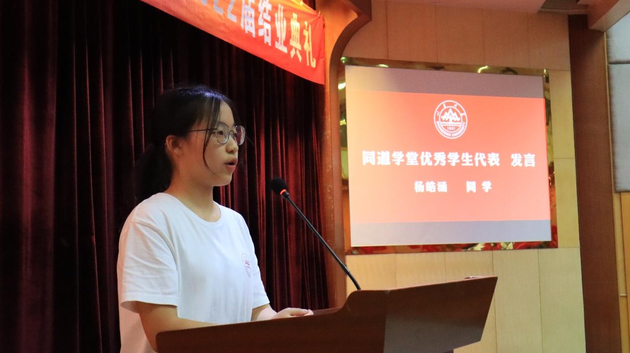 “石榴”优秀学生奖一等奖和“石榴”特长奖一等奖获得者、21-1班团支部书记杨皓涵作为同道学堂2022届优秀学生代表发言。她表示,山大的生活,让我深深感受到了强烈的归属感,文学院的栽培,让我深刻体会到了温暖的人文关怀,衷心感谢学校、学院、老师们的培养和帮助。她表示一定会牢记初心,砥砺前行,知行合一,踵事增华,自觉担起时代使命,努力在青春的赛道上跑出最好的成绩。