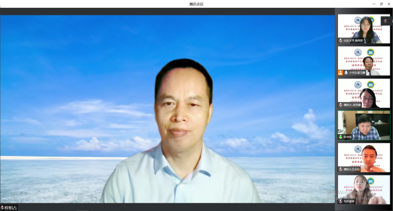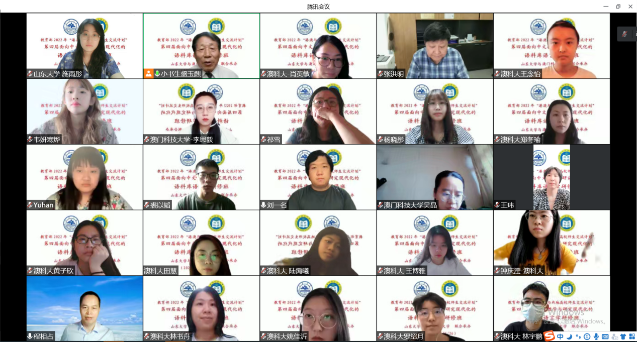 近日,教育部“港澳与内地高校师生交流计划”——第四届“面向中文教学研究现代化的语料库语言学研修班”通过线上的方式正式开班。本次研修班由山东大学与澳门科技大学联合承办,旨在加强港澳台地区学生与内地的交流,推动语料库在各学术领域中的应用,提高学生使用语料库进行相关科研的能力,进一步助力“一带一路”倡议实施与人才培养。澳门科技大学国际学院院长、世界汉语教学学会副会长张洪明,248cc永利集团副院长、博士生导师、程相占教授及全体学员出席开班仪式。开班仪式由248cc永利集团教授、研修班总负责人盛玉麒主持,张洪明院长和程相占副院长分别致辞。