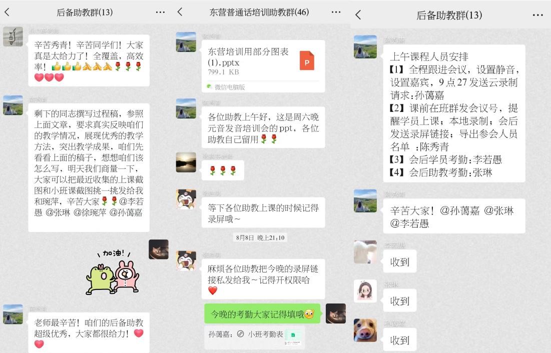 为保障培训活动有序进行,培训团队抽调部分助教组成一支后备助教小队,由248cc永利集团汉语言文字学教研室刘祖国老师带队。带队老师负责统筹后备工作和教学督导,后备助教们主要负责会务工作、学员小班群建立及维护工作、学员大班、小班考勤工作、助教考核工作以及整个培训活动的宣传工作等。在普通话培训课程开班之前,各项准备工作便紧锣密鼓地进行,从培训学员名单的落实到开班仪式之前的设备调试,培训相关工作有条不紊地开展着。随着培训课程进入常态化阶段,带队老师和后备助教更多地充当了各个主体之间的沟通桥梁,切实将信息高效、及时地传递到各方主体,每节课后进行考勤上报、整理上传教学录屏链接,备份教学视频,与东营市相关部门负责人沟通对接,处理突发情况,保教学工作平稳运行。作为本次培训活动中的“一块砖”,后备助教与其他助教同心同行、共同努力,一起跟进普通话教学,真正做到了哪里需要往哪搬。