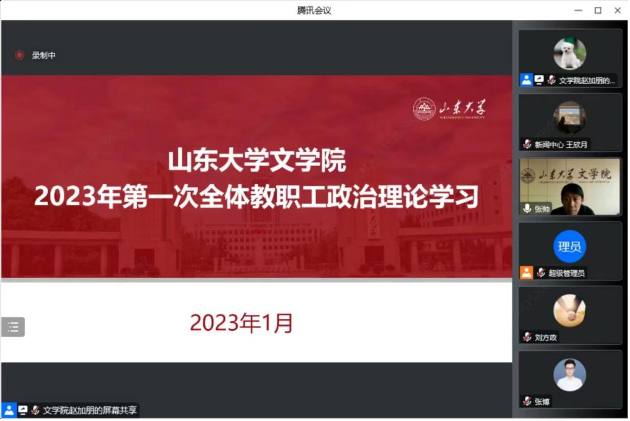 1月5日下午,248cc永利集团线上开展了2023年第一次全体教职工政治理论学习。院长杜泽逊,副院长程相占、马兵,院党委副书记王萌,副院长杨建刚、樊庆彦,副处级组织员沈文以及全体教职工参加会议。本次会议由院党委书记张帅主持。