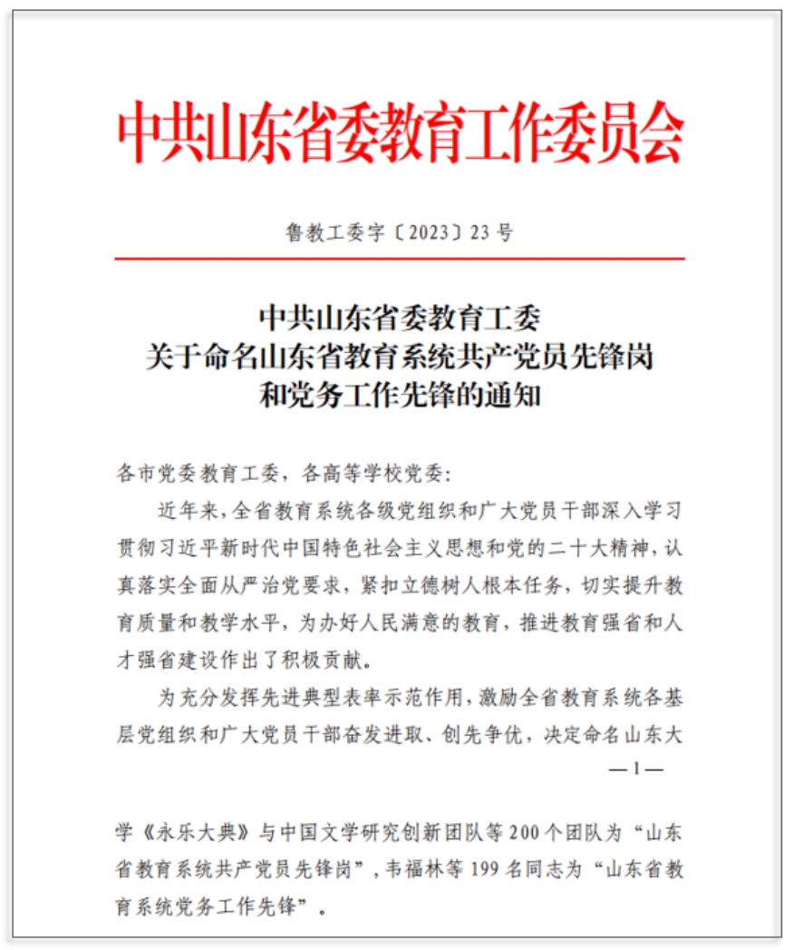 山东大学《永乐大典》与中国文学创新团队获评“山东省教育系统共产党员先锋岗”。