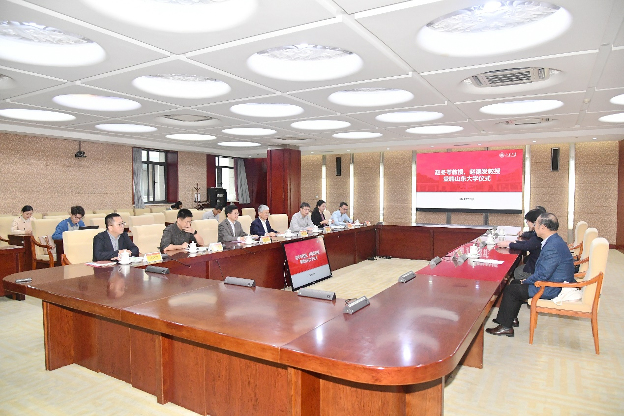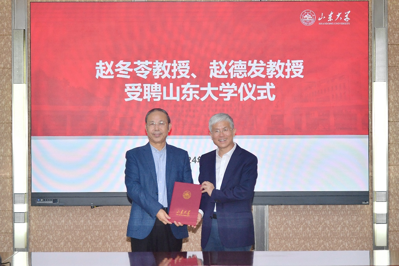10月17日,赵冬苓、赵德发受聘山东大学讲席教授、特聘教授仪式在中心校区明德楼一层会议室举行。山东大学校长李术才出席仪式并为赵冬苓教授、赵德发教授颁发聘书。聘任仪式由人事部部长、人才工作办公室主任刘健主持。