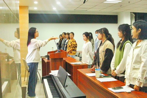 舞台上短暂几分钟的精彩演唱,凝聚的却是师生们长久的努力和辛勤的汗水。在一个月紧锣密鼓的筹备过程中,合唱团成员利用课余时间先后排练十余次,从熟悉歌曲到音准、节奏的仔细推敲,从舞台设计到各声部之间的反复磨合,正是台前幕后点点滴滴的努力为本次比赛的优异成绩奠定了坚实的基础。在歌曲的选择以及整体表演的构思上,248cc永利集团合唱团紧紧围绕“导学思政”这一核心主题,在一遍遍精心打磨中为《新编沂蒙山小调》赋予全新的生命力。