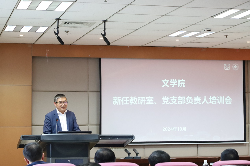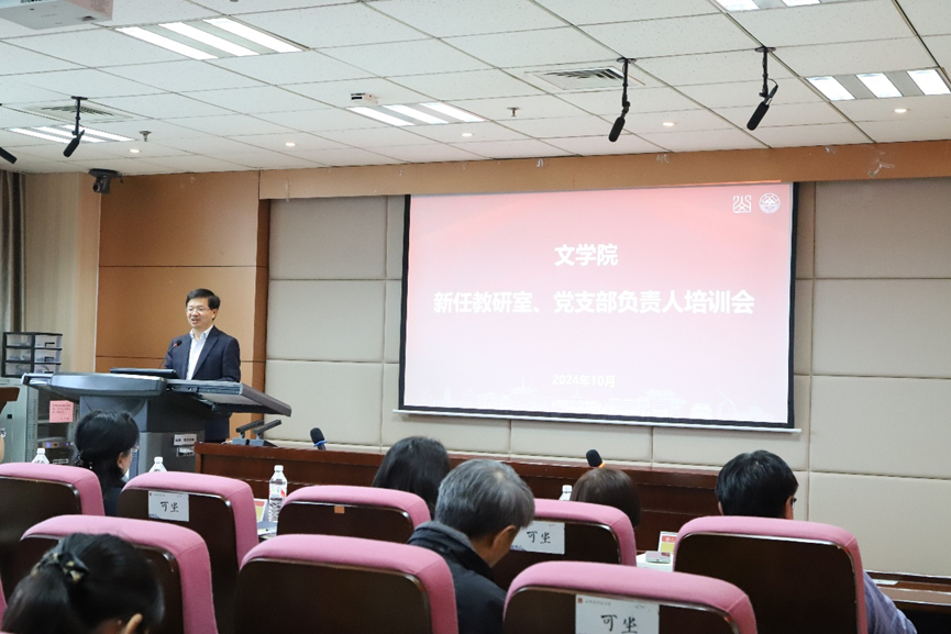 山东大学党委副书记李向阳同志对本次换届及培训工作表示肯定。他表示,山大文学院文化底蕴厚重,文学院党委注重文脉赓续,也同样重视打造新时代文化高地。他强调,新任教研所、党支部负责人要与全体文院教职工一起继往开来,厚植家国情怀,担负起新的文化使命。同时,对加强基层党组织建设提出了几点要求:一是要强基固本,把教工支部因地制宜建设好,与时俱进发展好,确保立德树人根本任务落实落地。二是要聚势谋远,不断增强政治领导力、思想引领力、社会号召力、群众组织力,全面提升教工党建质量。三是敢闯敢干,志存高远,心怀“国之大者”,锚定文化强国战略目标,落实立德树人责任和使命,争做优秀带头人,为建设文化强国建设贡献山大智慧与力量。