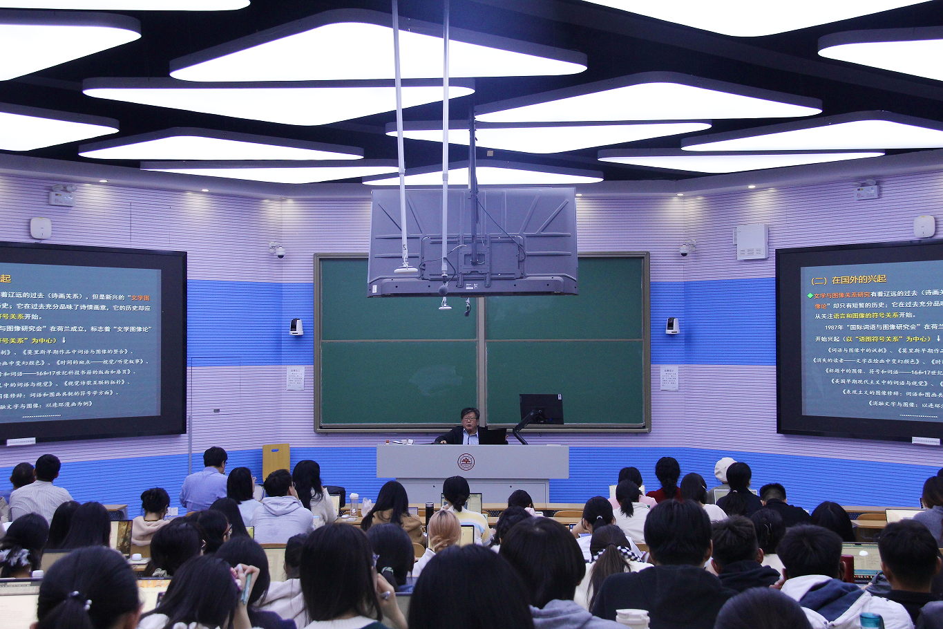 第三场讲座于11月13日19点举行,主题为“文学与图像之符号关系”,由艺术学院尹德辉教授主持。赵宪章教授首先讲述了语图符号互相模仿的两种现象,由此发现“诗意画”顺势而为往往可以成为画史上的精品;反之,“题画诗”逆势而上,在诗史上的地位则很难和前者在画史上的地位相匹配,呈现出一种“非对称态势”。赵宪章教授以《这不是一只烟斗》为例,提出语图符号的“实指”和“虚指”决定了他们发生矛盾时的“强势”和“弱势”,这导致二者在共享同一文本时语言对图像的驱逐。中国的诗画关系史,是强势的语言符号不断挤压图像符号的历史,受西画的影响,这一趋势在民国之后开始改变,题画文学逐步退隐。而后,赵宪章教授讲述语图符号的不同表意机制。语言的所指和能指关系是任意的、约定俗成的;图像作为意指符号所遵循的是相似性原则。这种相似性原则决定了图像的隐喻本质,隐喻对于语言来说只是它的修辞,但是对于图像来说是它的全部。图像的隐喻导致“假相”的合法性,而这种合法性源自图像的人为属性,“人为性”也就决定了图像之“相似”实则是对视觉机制的迎合。进而,赵宪章教授论证题画文学之可能的问题。赵宪章教授认为王充的“图像空器”譬喻和柏拉图的“洞穴之喻”十分相似。王充的“器空无实”道出了图像符号的特点,这种超实利性为愉悦之情的生发提供了自由空间。柏拉图的“洞穴之喻”意在表达“影像”不是真实的世界,但是却有很大的迷惑性,以至于使人“以假当真”,并可能会沉浸其中而不能自拔。赵宪章教授借用“虹吸”概念指称图像作为“空洞”符号的诱惑力,图像的虚拟性决定了它也是一种具有虹吸力的“黑洞”,由此,题画文学之可能是“空洞”图画的期待和填补。最后,赵宪章教授谈及中国画的形制为语词“被虹吸”预留了物性空间,这种“预留空间”主要表征为“画心留白”和“画幅补白”两种类型。