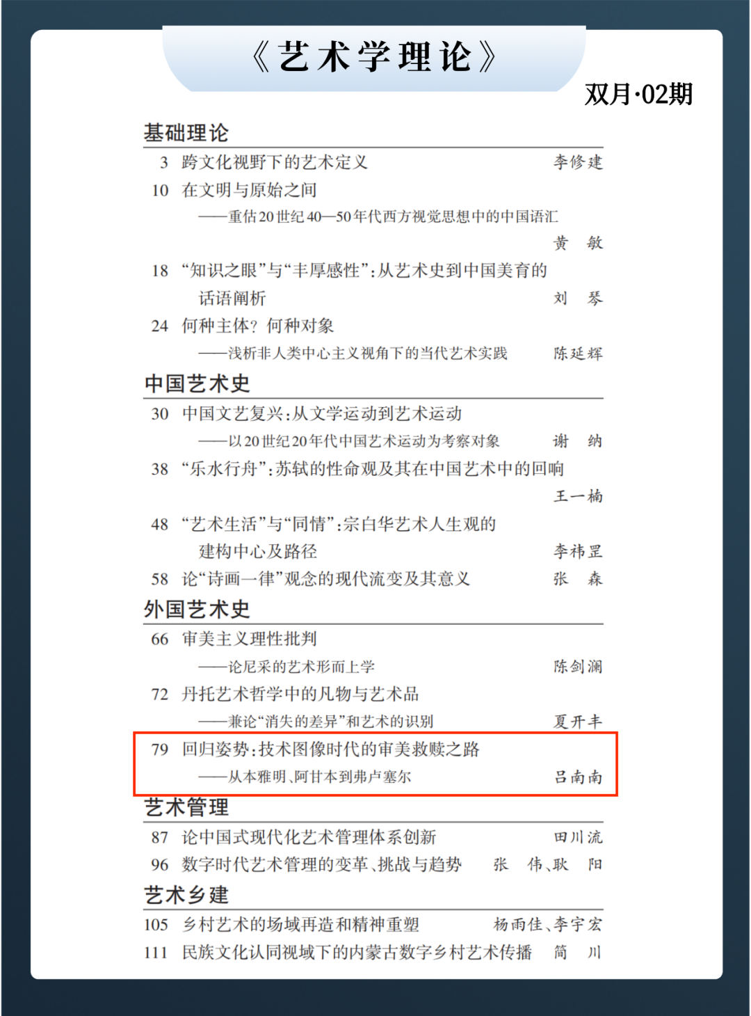 近日,人大复印报刊资料《艺术学理论》2025年第2期全文转载了248cc永利集团博士生吕南南(导师为凌晨光教授)原发表在《美育学刊》2024年第5期的《回归姿势:技术图像时代的审美救赎之路——从本雅明、阿甘本到弗卢塞尔》一文。