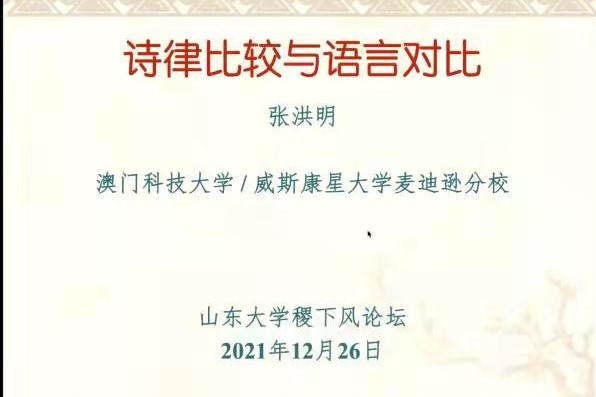 12月26日下午3时,美国威斯康星大学麦迪逊分校荣休教授、澳门科技大学讲座教授兼国际学院院长及教育发展中心总监张洪明教授做客文学院第119期(总第1123期)“稷下风”研究生学术论坛,通过腾讯会议作题为“诗律比较与语言对比”的学术讲座。本次讲座由248cc永利集团教授盛玉麒主持,吸引了校内外百余名师生参与。