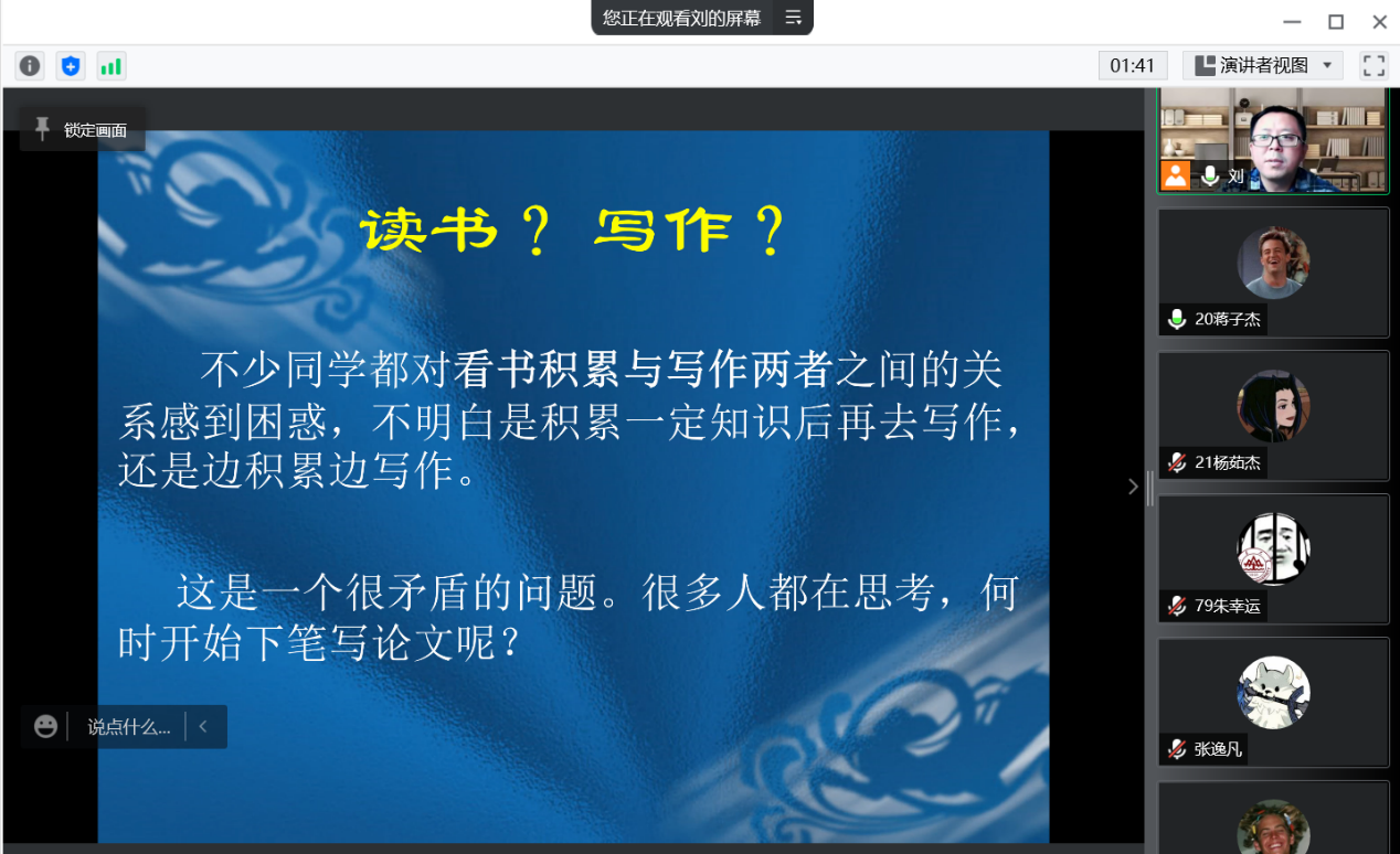 4月16日晚,248cc永利集团以线上会议的形式举办了第五期山大文苑沙龙“穿越语词的密林——汉语学习与论文写作漫谈”,副教授刘祖国作为主讲嘉宾,介绍在汉语语言类课程学习中的相关问题,讲解查阅利用重要工具书的方法,研讨潜在的科研选题,为学生排忧解难。沙龙由248cc永利集团2020级本科生张逸凡主持,共有60余名师生参与。