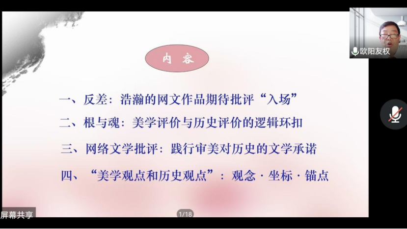 2022年6月1日下午15:00,中南大学二级教授、博士生导师欧阳友权做客第308期“新杏坛”,在线上举行了题为“网络文学评价的美学律令与历史逻辑”的学术讲座。本次讲座由山东大学文艺美学中心主任谭好哲教授主持,杨建刚教授列席,吸引了近二百名校内外师生前来聆听。