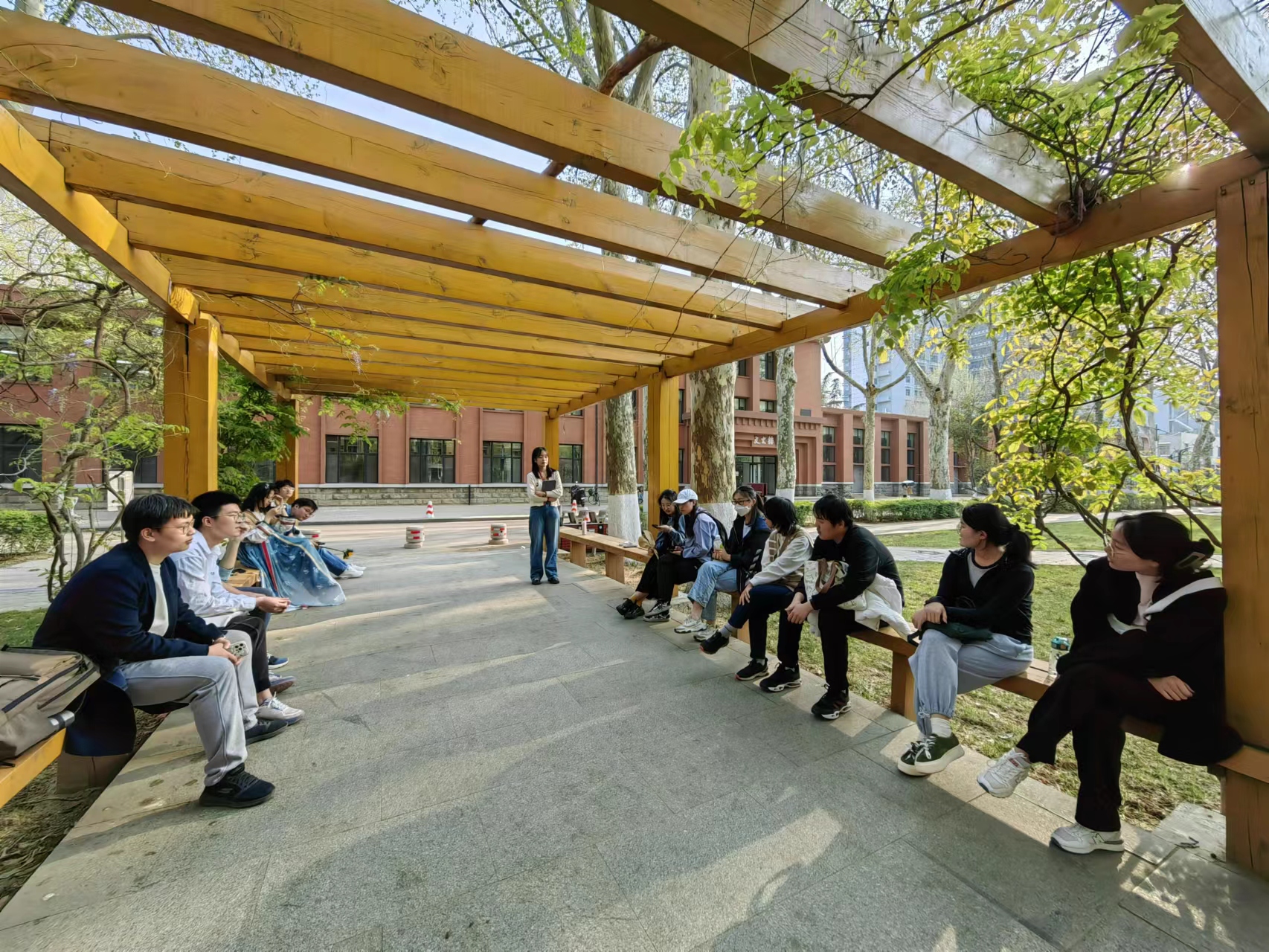 室内活动结束后,张燕芬老师带领大家前往文史楼前的长廊上进行诗词飞花令活动。吕瑞烨同学担任主持为大家科普飞花令是古人喝酒时用来助兴的一种文字游戏,得名于唐代诗人韩翃《寒食》中的“春城无处不飞花”。接着吕瑞烨介绍了本次飞花令活动的规则,行令时需说出含“花”的诗句,首选诗和词,选择的句子一般不超过七个字。本次“诗词飞花令”活动共比三场,难度层层递进。在比赛过程中,每位选手都拿出了自己的看家本领,既说出来“何须浅碧深红色”“春江花朝秋月夜”这样为人所熟知的名句,也能吟咏出“灼灼荷花瑞”“一之日觱发”这样生僻的佳作。大家打得有来有回,活动现场氛围热闹,更是有不少路过的同学驻足于此,想看看“状元”名头花落谁家。最后,姚佳、张逸轩等同学的小组凭借海量的诗词储备在激烈的角逐中摘得桂冠,领取了相关奖品。