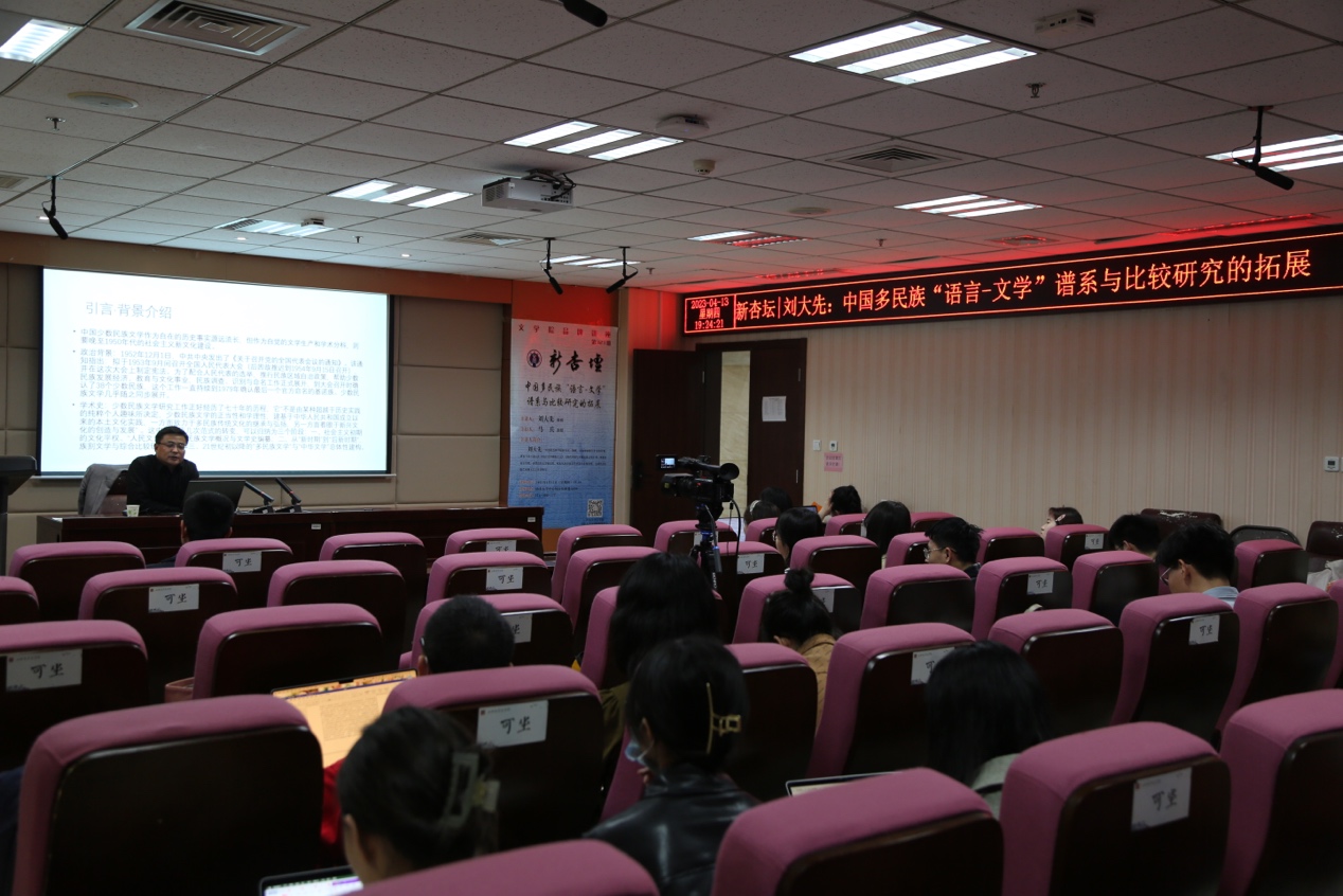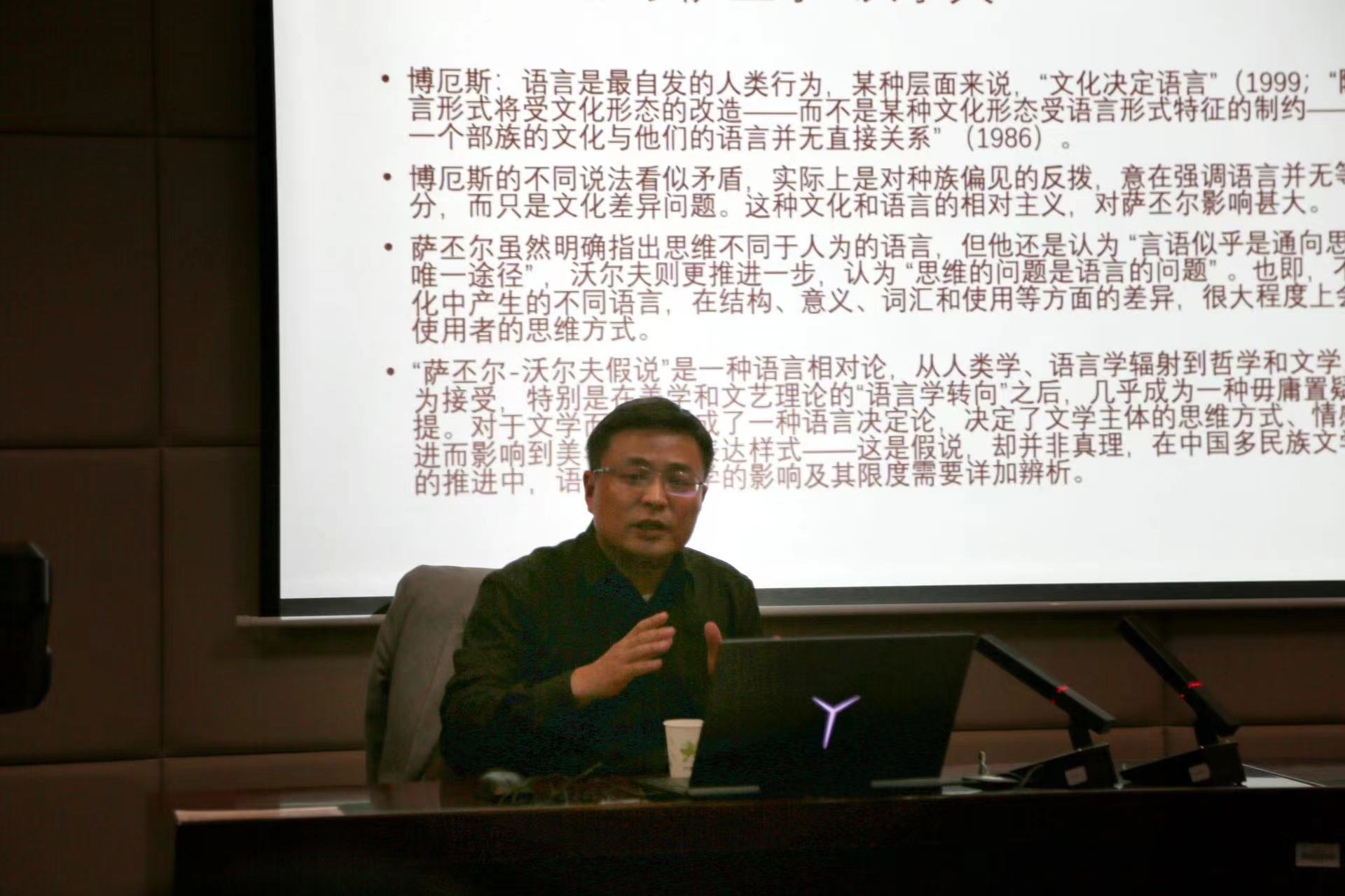 4月13日晚19时,中国社会科学院民族文学研究所研究员、中国社会科学院大学教授刘大先做客第321期“新杏坛”,于知新楼A620室及线上腾讯会议平台同步开展学术讲座,题为“中国多民族‘语言-文学’谱系与比较研究的拓展”。本次讲座由马兵教授主持,何瑛副教授出席,吸引了数百名师生前来。