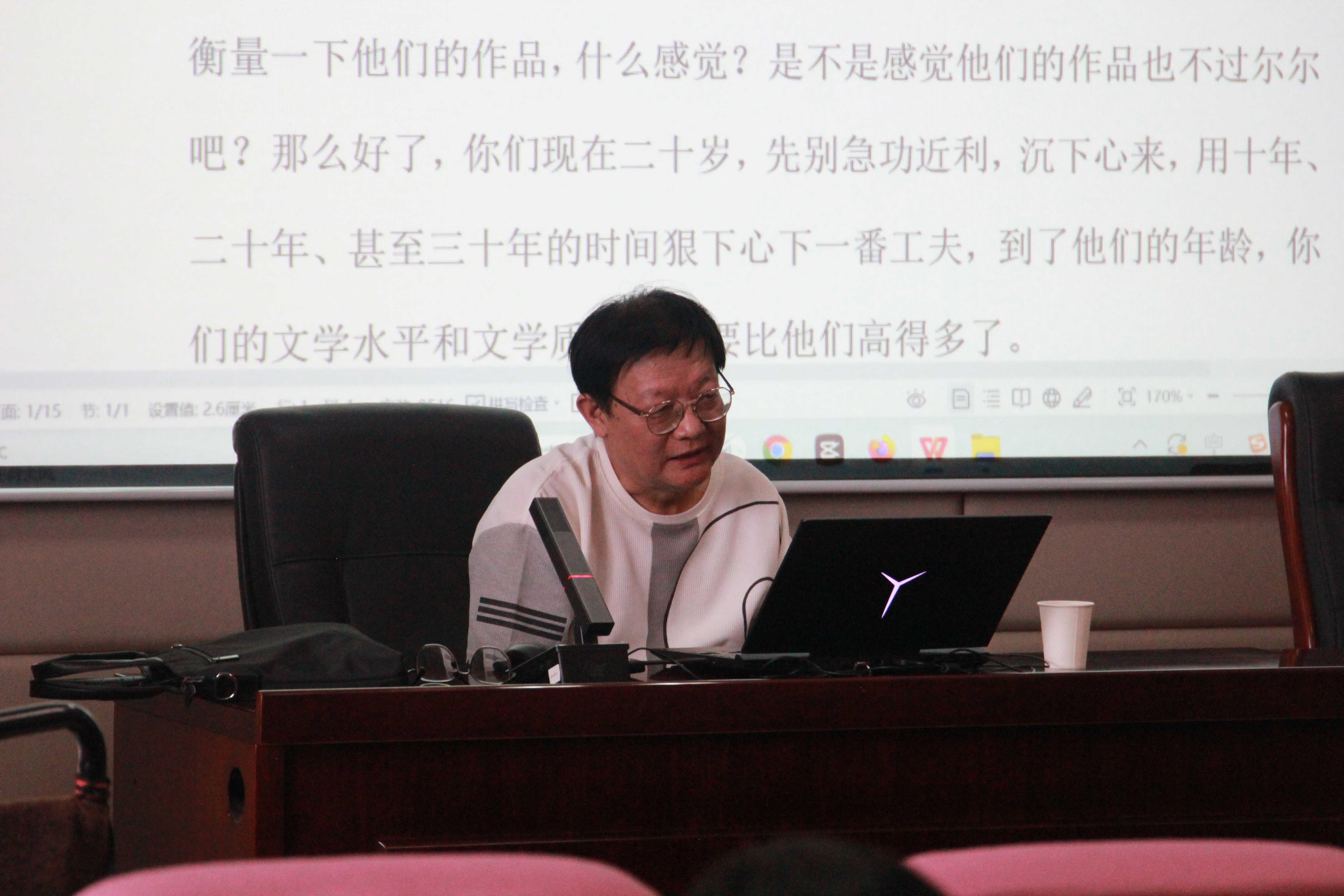 王安琪首先界定了优秀小说的几条重要标准。他认为,一部好的小说在语言上要讲究,故事上要精彩,人物上要恰当,立意上要新奇。紧接着,他根据自己写作的经验,与在座师生分享了锤炼文学语言,提炼小说情节,设置文学人物,寻找作品立意的具体方法。王安琪认为,只有做到了以上四点,一部小说才能经得起淘洗。王安琪还以盆景为喻,给同学们演示了“组合法”“合并关联法”等小说构思的具体方法。