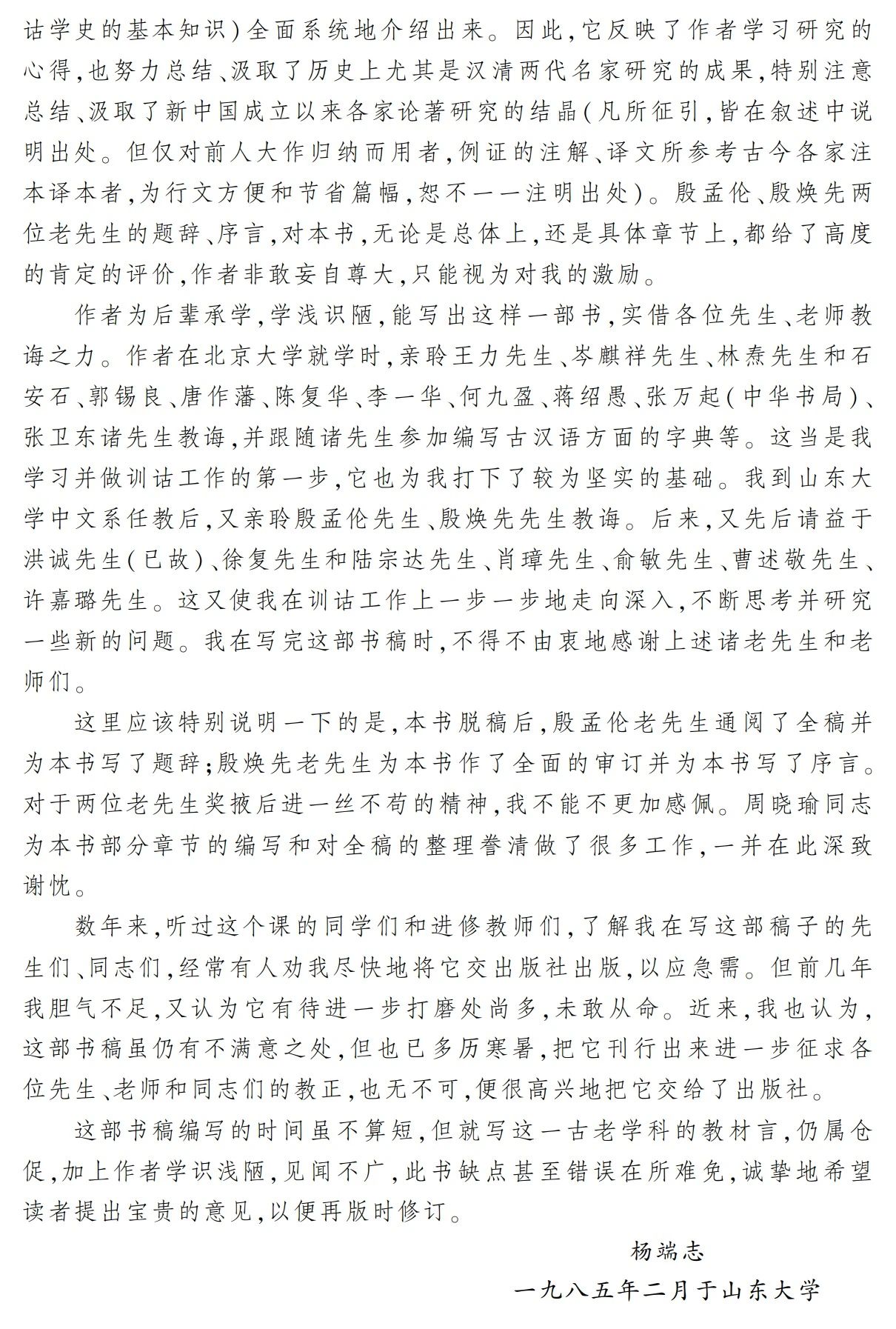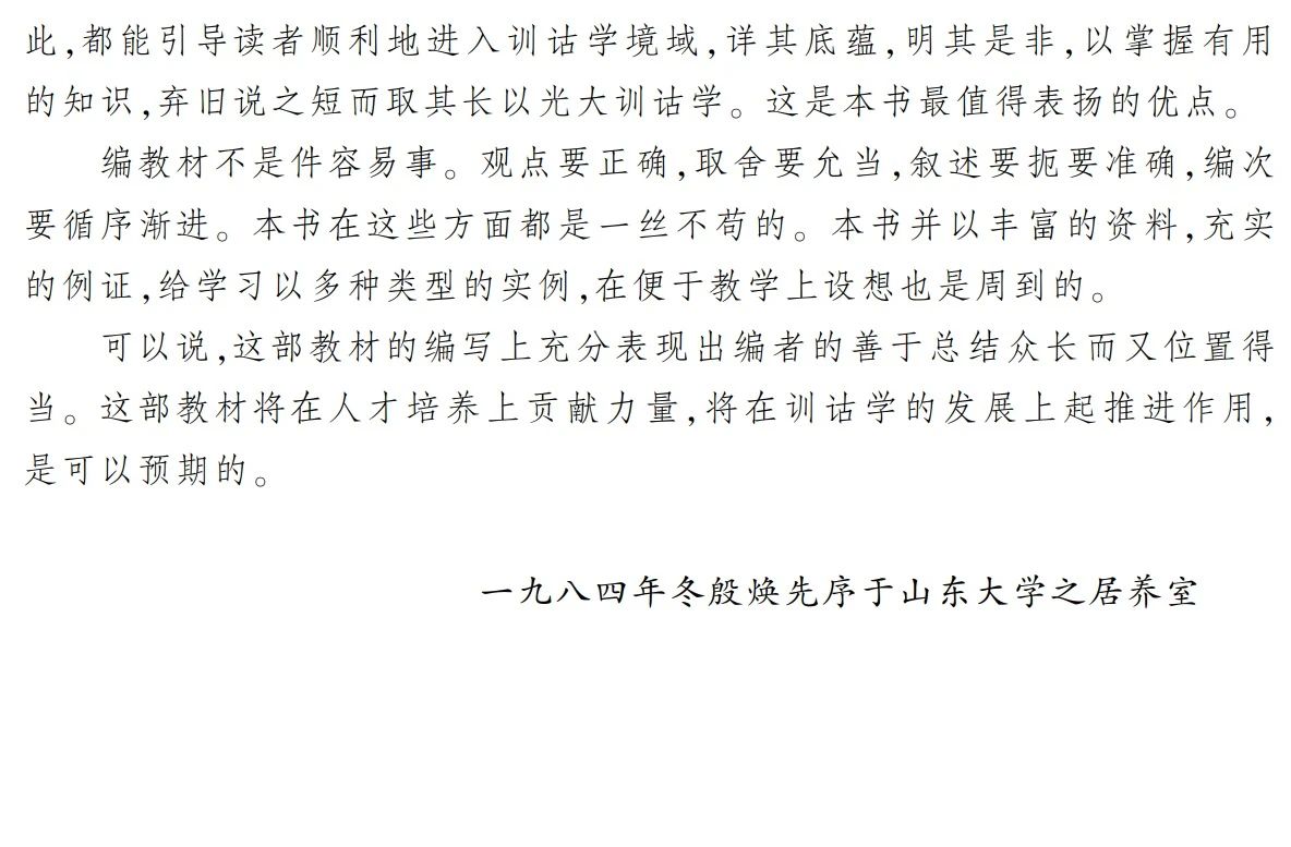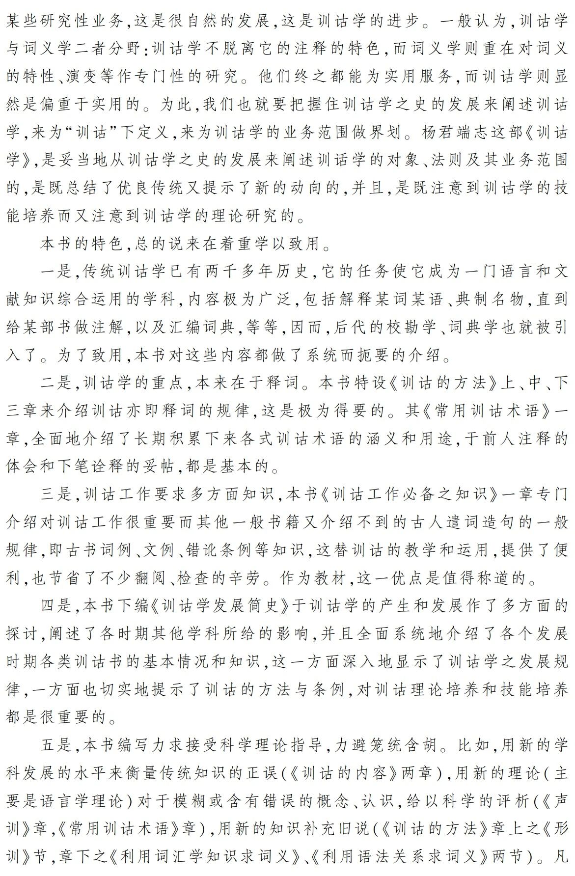 杨端志先生的《训诂学》初版之时,正值改革开放后不久,我国高等教育大学用书极缺的时代,故此书一经出版,便得到语言学界前辈专家、古文献整理领域、出版领域等的高度关注。时任中国训诂学会副会长殷孟伦先生为之“题辞”,称其继承了“清代乾嘉而后,段王之学风”,“卓然不群,宜广九有之被声教”。