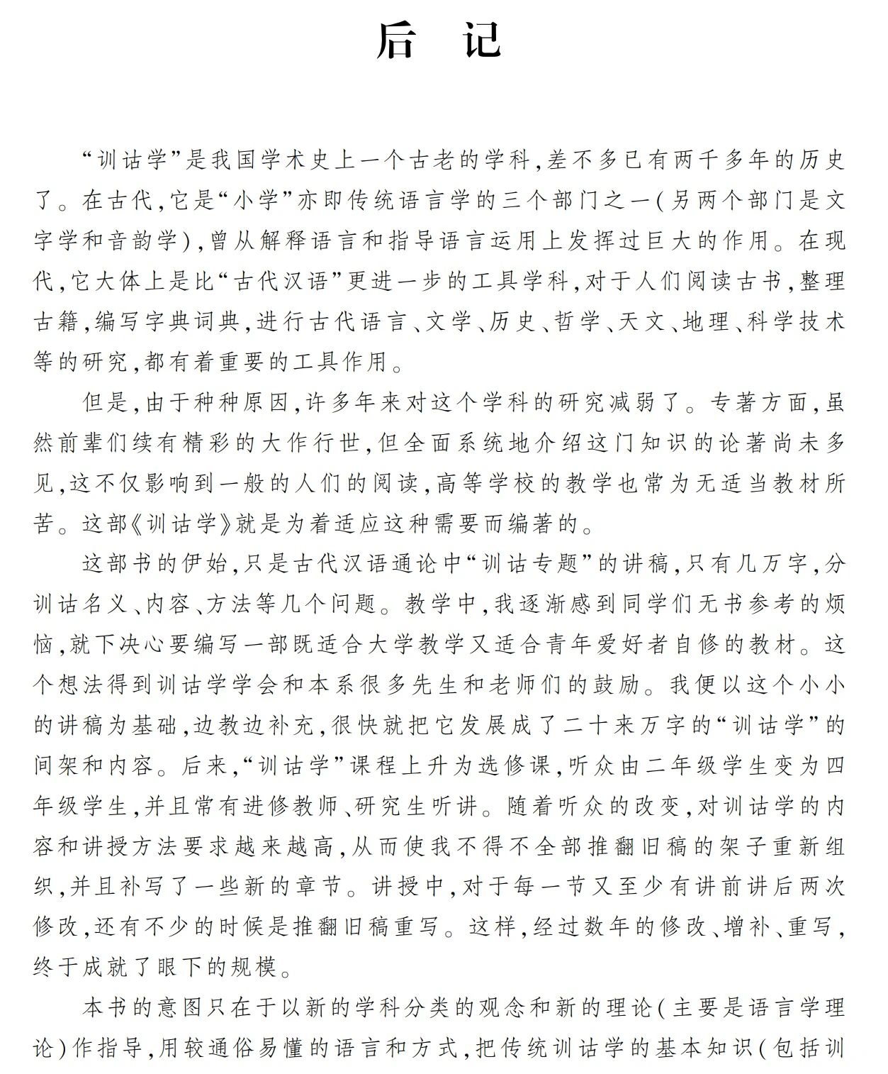 《训诂学》出版30多年来,其中的概念、论断、例证,甚至框架,一直被同行引用不衰。此次重新整理出版,以首版作为底本,同时改正原书中的排校错误,重点复核了全书引文,并订正引文错字以及繁简字转换讹误。